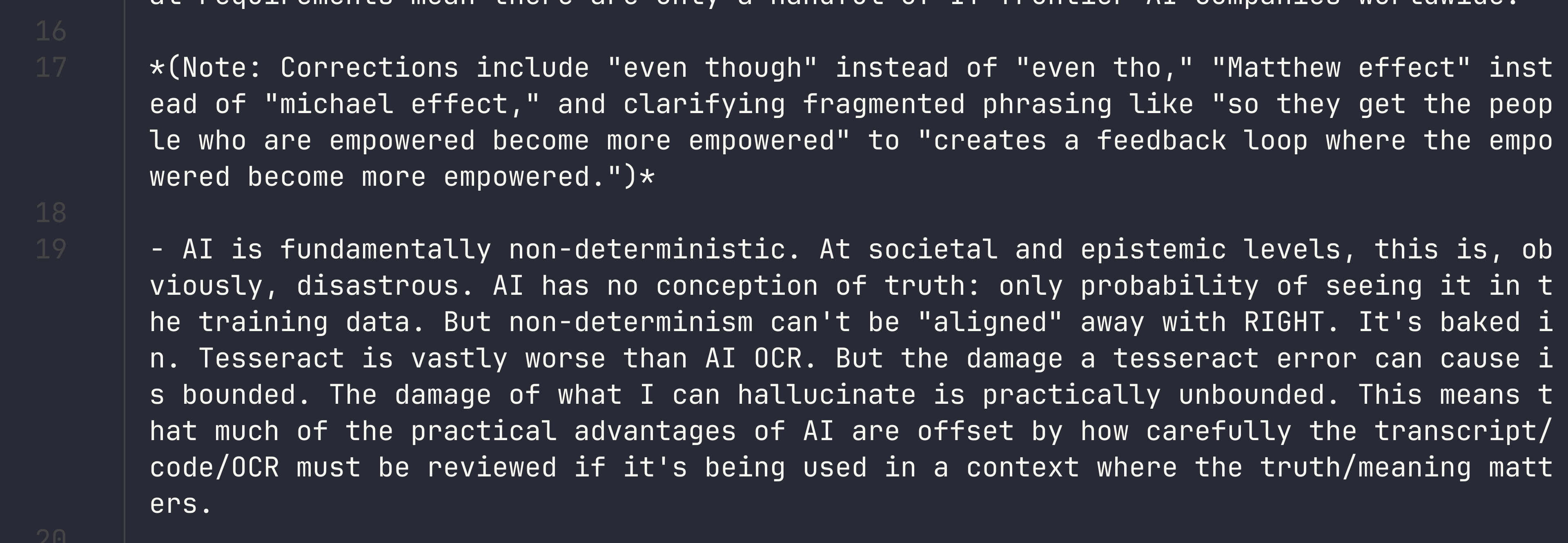 Qwen3-VL has a bad habit of including its thinking in the output even when it’s not supposed to. It even had the gall to correct “michael effect” to “Matthew effect”. (It was right, of course; I suspected I had mis-remembered the name, and would have caught it in fact checking.) This crossed a line: I don’t want OCR editing my text, even if it makes it better! This was especially offensive because the handwritten text it was correcting without my consent was my forthcoming essay, Underrated reasons to dislike AI, and non-determinism featured prominently.